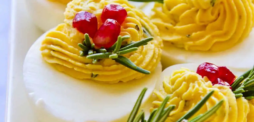 - Pipe or spoon the filling back into the egg whites, and garnish with a few fresh pomegranate seeds and tiny sprigs of rosemary. Serve on a tray garnished with rosemary and pomegranate seeds.