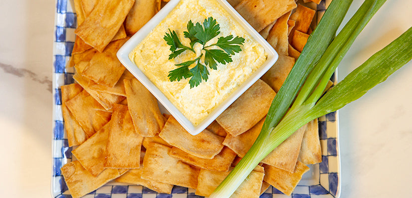 Sliced bread, preferably pumpernickel or rye, cut into triangles, toasted or pita chips - easy peasy!