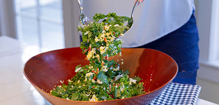 - Toss kale, shaved egg, pepperoncini, bacon and cheese with ¼ cup dressing.