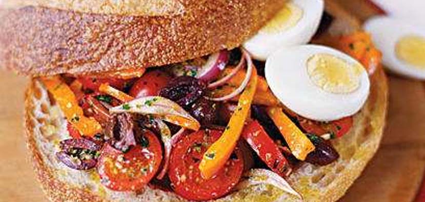 - Transfer the mixture to a large bowl. Add the bell pepper, tomatoes, onion, olives, and the reserved bread filling. Toss to combine.