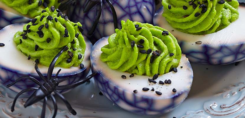 These deviled eggs are not only delicious, but they are also fun to make. Kids enjoy making the web patterns on the egg white. Thanks to Eggland's Best Eggs for the inspiration.